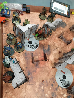 Las dos primeras rondas de juego nos dedicamos más que nada a mover, escondernos, Silas a joderme las acciones para puntuar con un poder psíquico que sacaba de 11 en 11 en los dados y un poquito de "toma y dakka" entre sus Erradicadores y mis WarDogs.